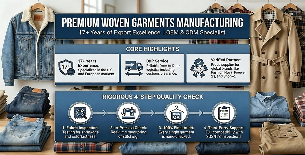 We have earned a good reputation from our partnered customers, such as Guess, Shopko, Marmaxx, Ross, Forever 21, Fashion Nova, Blackford, Truworths, and others. With the support of our customers, our business is expanding globally. We are always ready to do business with you. Thank you for your attention, and we warmly welcome you to join us.